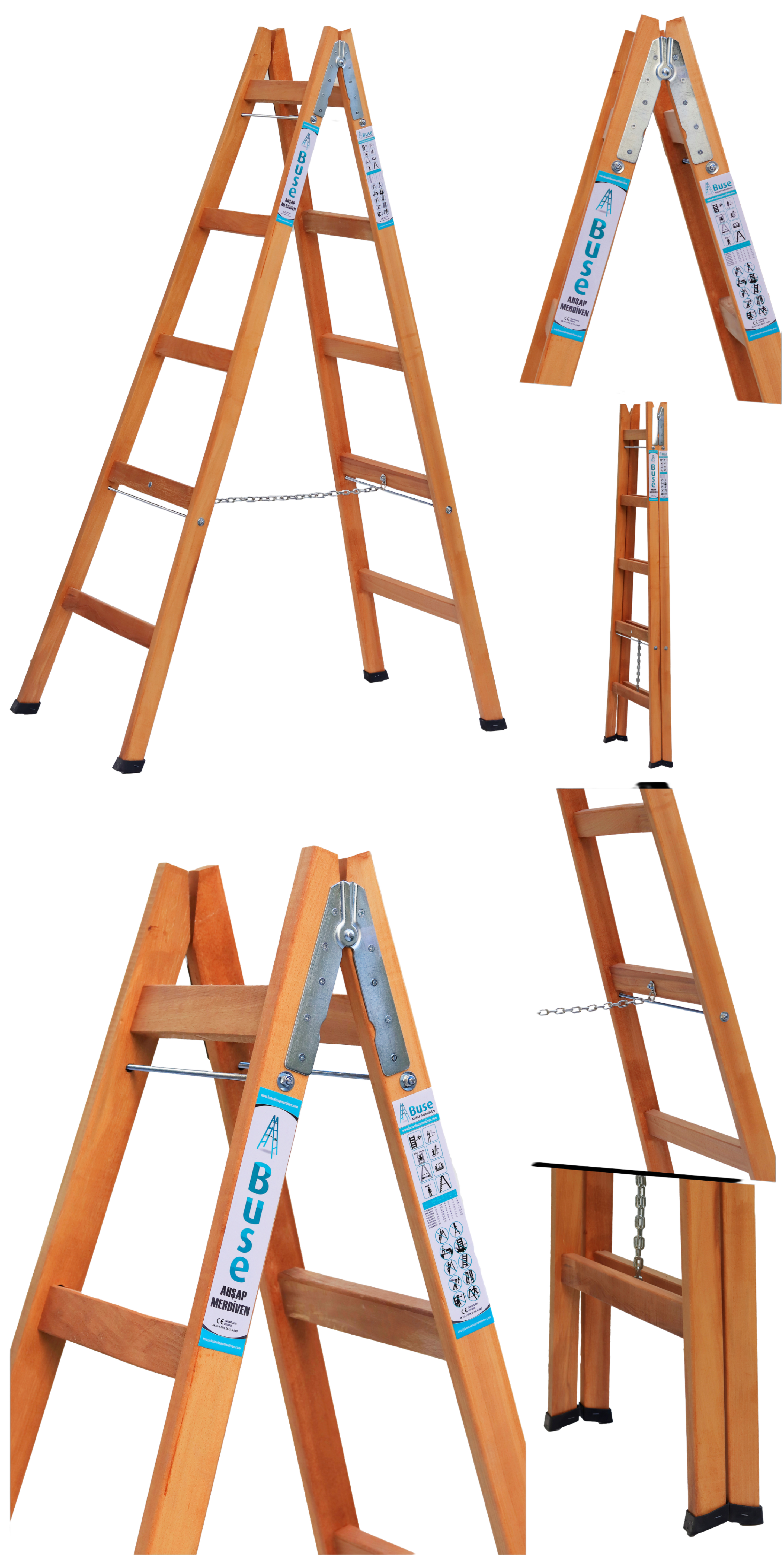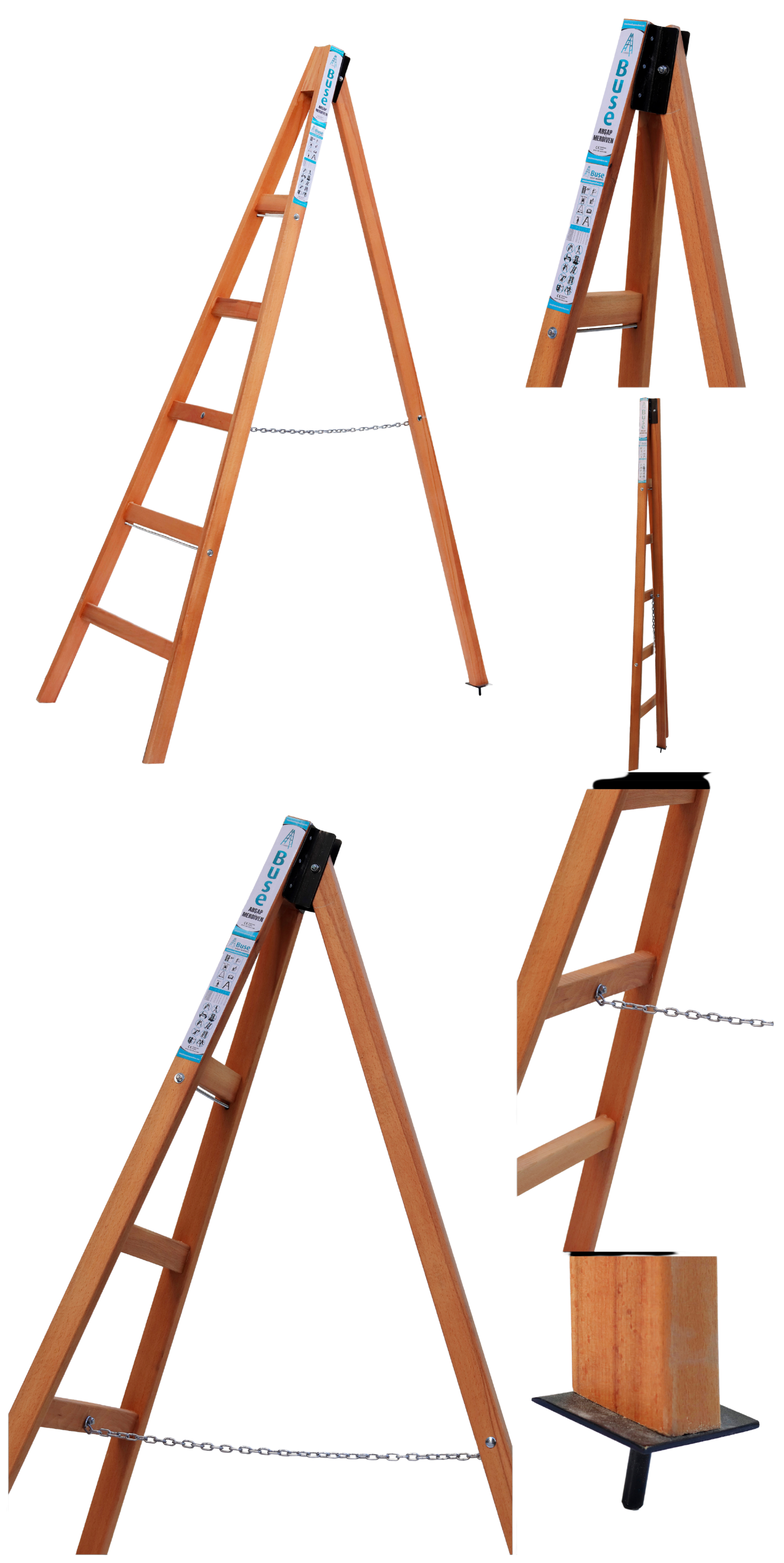 Bu model, iki tarafı da basamaklı olan klasik A tipi ahşap merdiven yapısına sahip. Hem profesyonel hem ev kullanımına uygun.